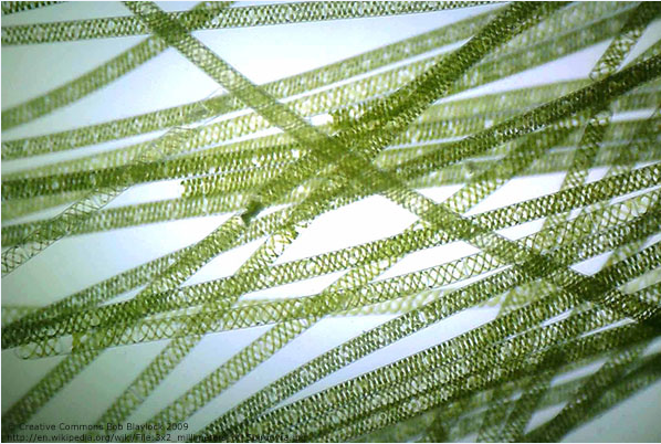 Bob Blaylock (2009) Spirogyra. Available at: https://en.wikipedia.org/wiki/File:3x2_millimeters_of_Spirogyra.jpg (Accessed: 15 October 2019).